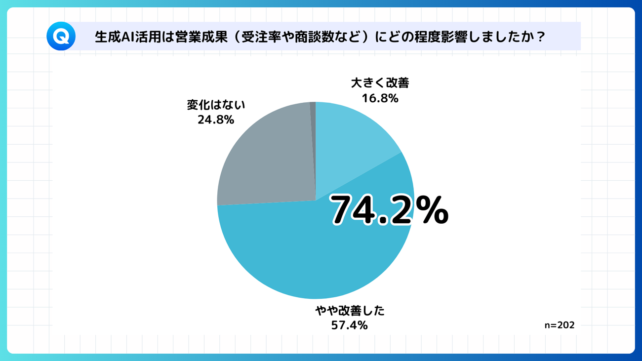 生成AIを営業活動に活用している担当者のうち、74.2%が「受注率や商談数などの営業成果が改善した」と回答。「ほぼ毎日活用している」層では、85.3%が成果改善を実感しており、継続的な活用が成果に結びつきやすいことが示された。