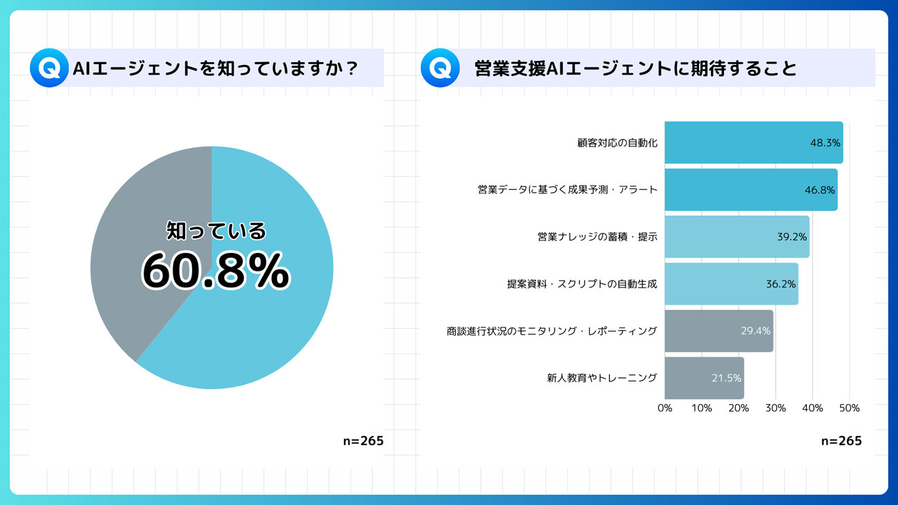AIエージェントの概念を「知っていた」営業職は60.8%。営業支援AIエージェントに期待する役割としては、「顧客対応の自動化」(48.3%)、「営業データに基づく成果予測・アラート」(46.8%)が上位だった。