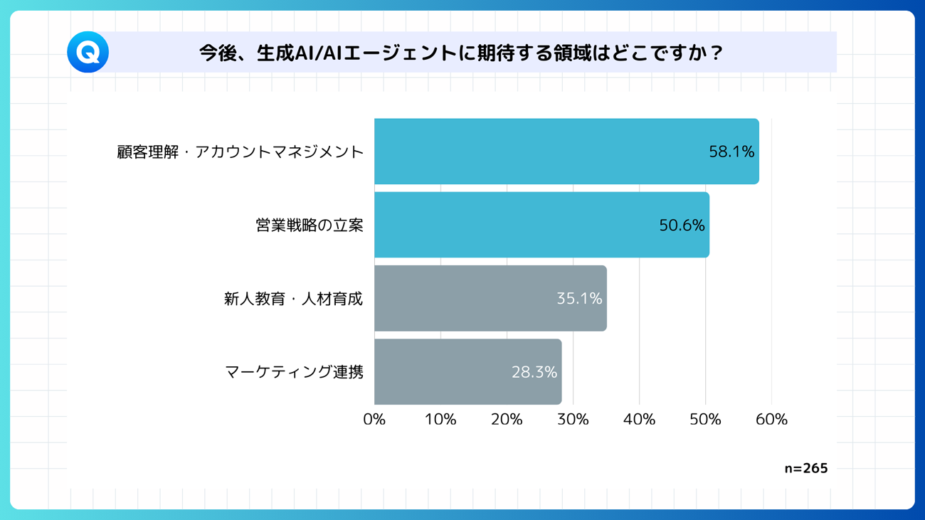 今後、生成AI/AIエージェントに期待する領域として、「顧客理解・アカウントマネジメント」(58.1%)、「営業戦略の立案」(50.6%)が上位だった。