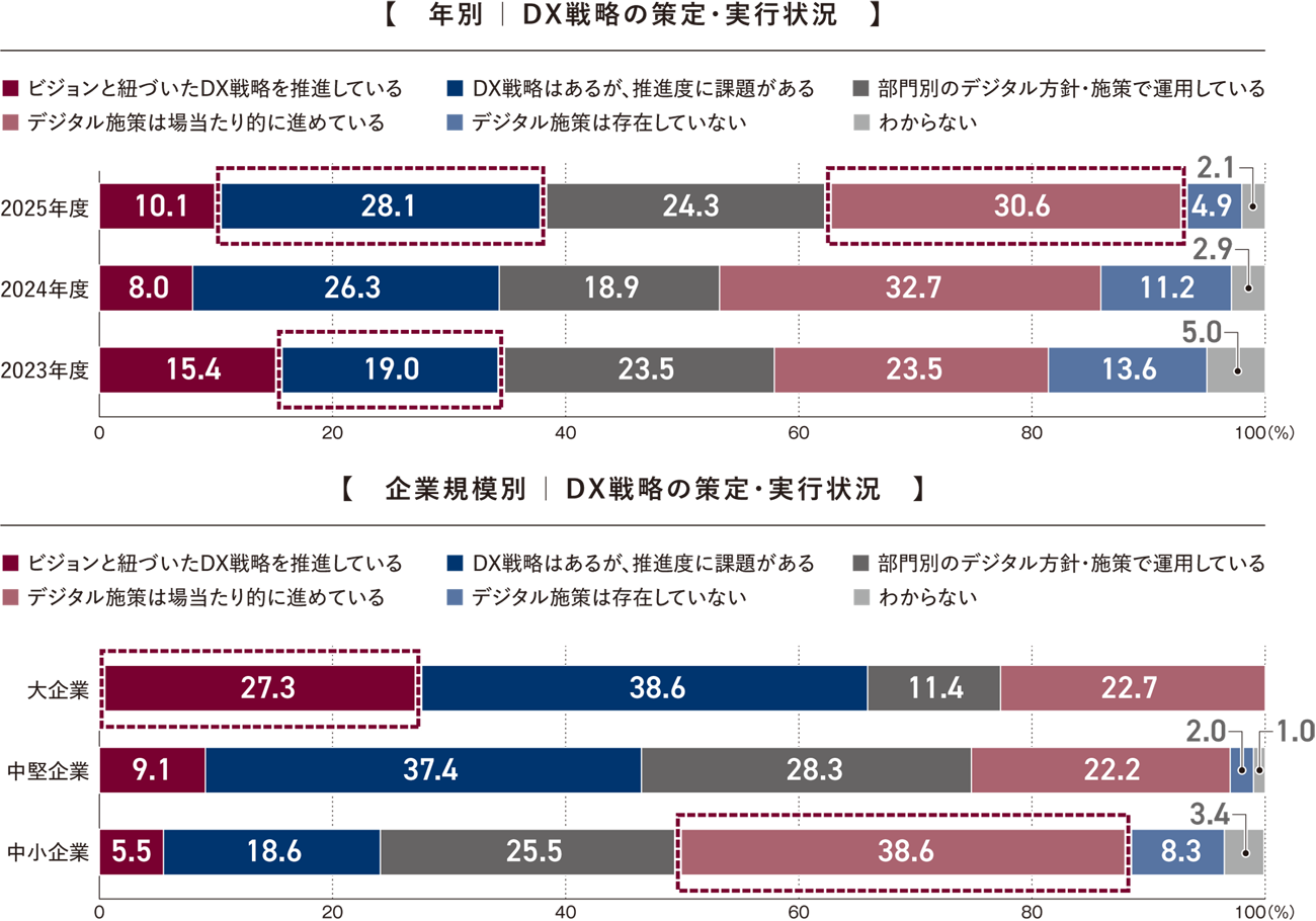 全体では、「デジタル施策は場当たり的に進めている」(30.6%)がもっとも多く、「DX戦略はあるが推進度に課題がある」(28.1%)が続いた。「DX戦略はあるが推進度に課題がある」の回答率は2023年19.0%から2025年28.1%へ上昇しており、実行段階の企業が増加していることがわかる。一方で、「ビジョンと紐づいたDX戦略を推進している」は約1割にとどまった。