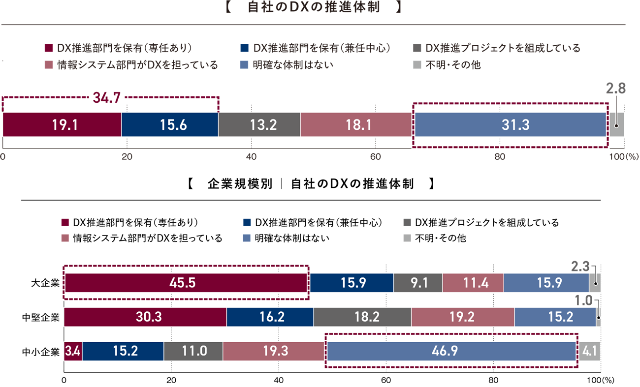 大企業では半数近くが「DX推進部門を保有(専任あり)」と回答。企業規模でDX推進体制に差