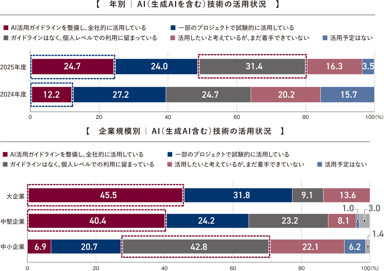 全体では、「ガイドラインはなく、個人レベルでの利用に留まっている」(31.4%)がもっとも多く、「活用したいと考えているが、まだ着手できていない」(16.3%)も一定数存在するが、「活用予定はない」は3.5%にとどままった。年次比較では、「全社的に活用」が2024年12.2%から2025年24.7%へ上昇しており、全社レベルでの活用が広がりつつある。