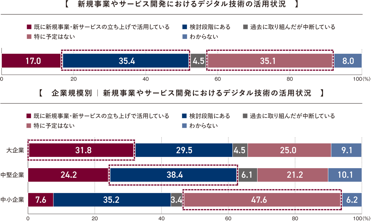 全体では、「検討段階にある」(35.4%)がもっとも多く、「特に予定はない」(35.1%)がほぼ同水準で続いた。「既に新規事業・新サービスの立ち上げで活用している」は17.0%にとどまり、実際に活用まで進んでいる企業は2割弱だった。