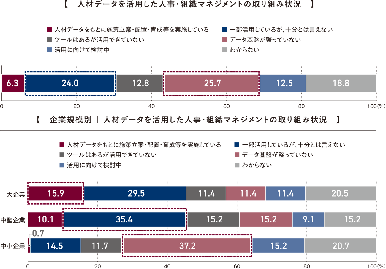 全体では、「データ基盤が整っていない」(25.7%)がもっとも多く、次に「一部活用しているが、十分とは言えない」(24.0%)が続いた。「人材データをもとに施策立案・配置・育成等を実施している」は6.3%にとどまり、人材データを活用できている企業は限られていることがわかる。