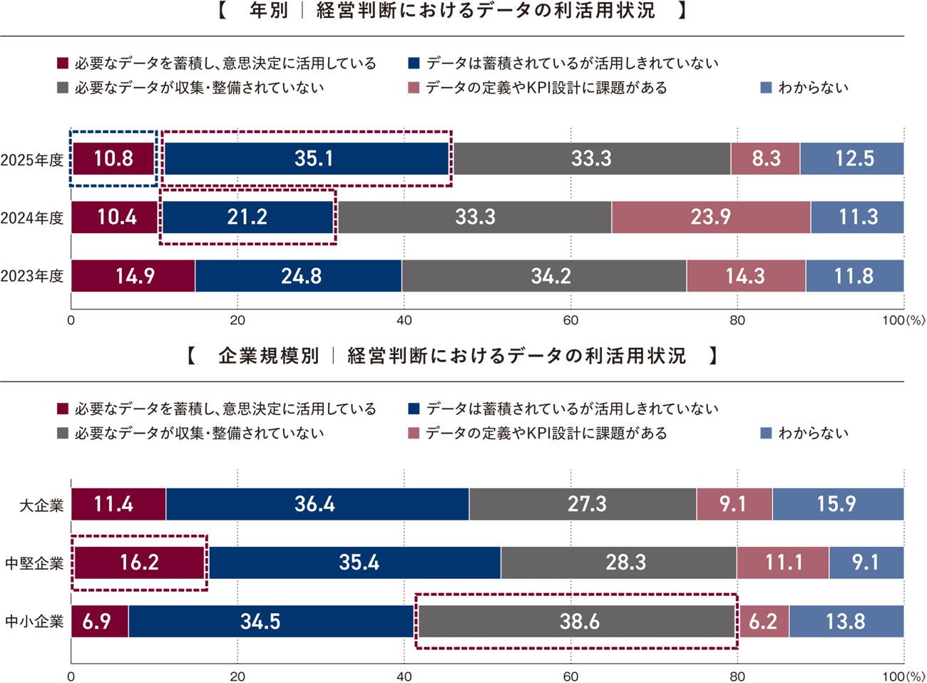 年次比較では、「データは蓄積されているが活用しきれていない」が21.2%(2024年)から35.1%(2025年)へ上昇しており、データは整備されつつも活用に至っていない企業が増加していることがわかる。