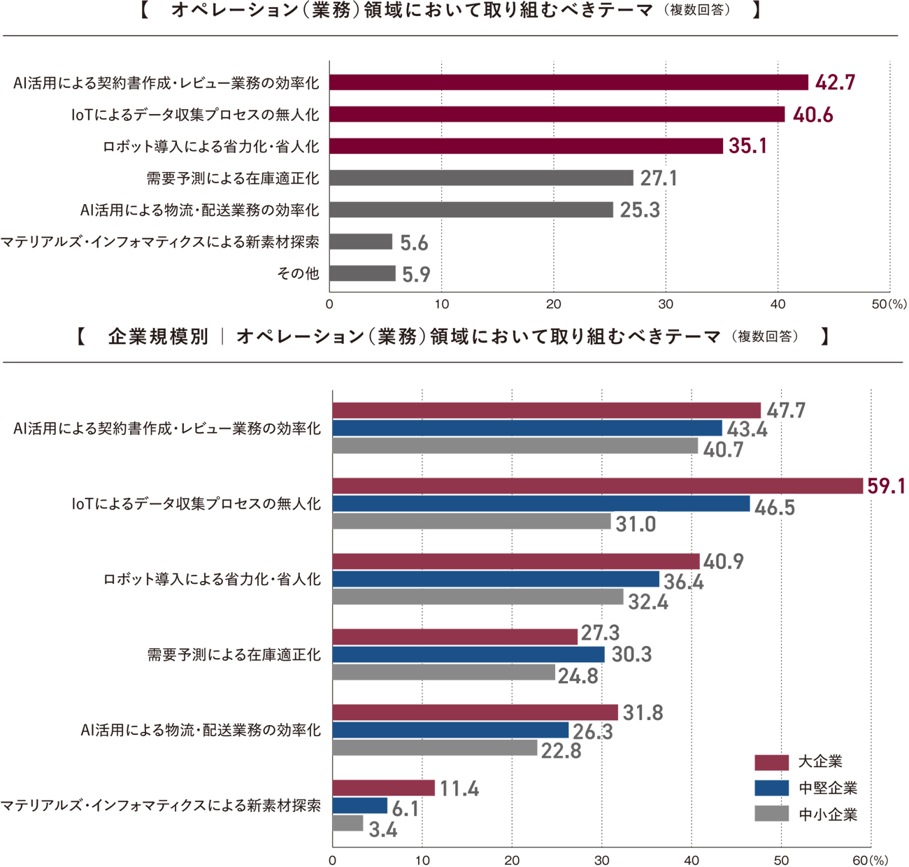 企業規模別にみると、大企業では「IoTによるデータ収集プロセスの無人化」(59.1%)が高く、現場データの自動取得や可視化を通じて業務効率や判断精度の向上を図る動きがみられる。全体として、オペレーション領域では、AI・IoT・ロボティクスを中心に、効率化・自動化への取り組みがテーマになっている。