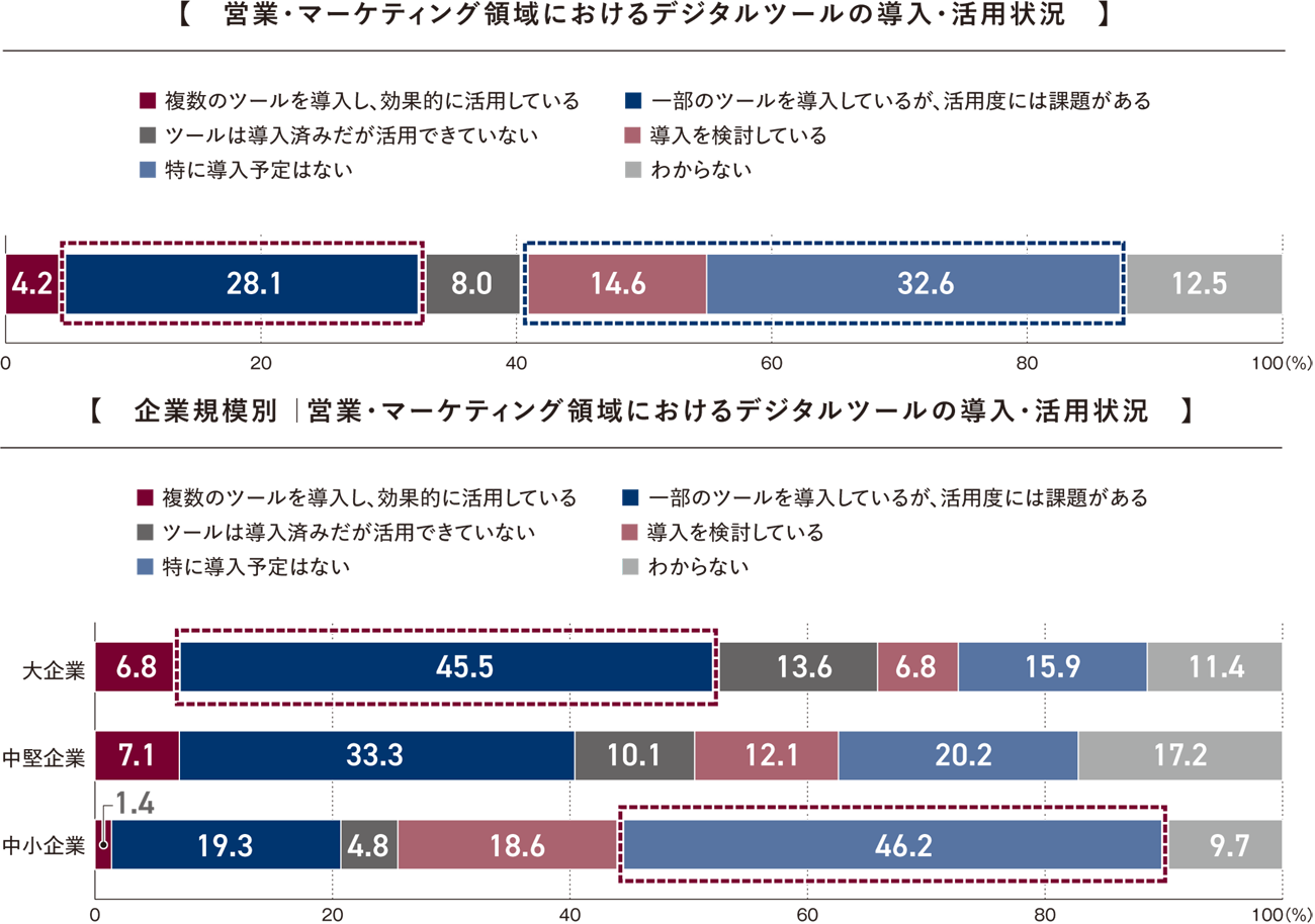 営業・マーケティング領域におけるデジタルツールは、半数近くの企業で導入が進まず