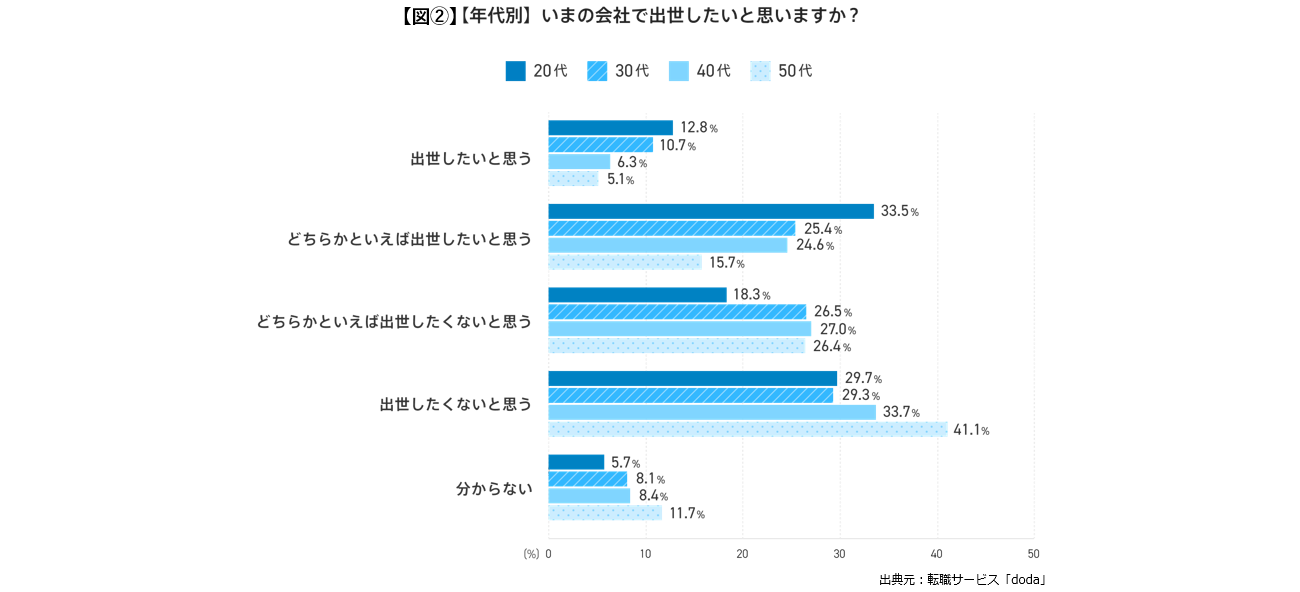 20代では出世したい人と出世したくない人の割合が同程度だったが、年代が上がるにつれて、出世したくないと考える人の割合が増える傾向が明らかになった。