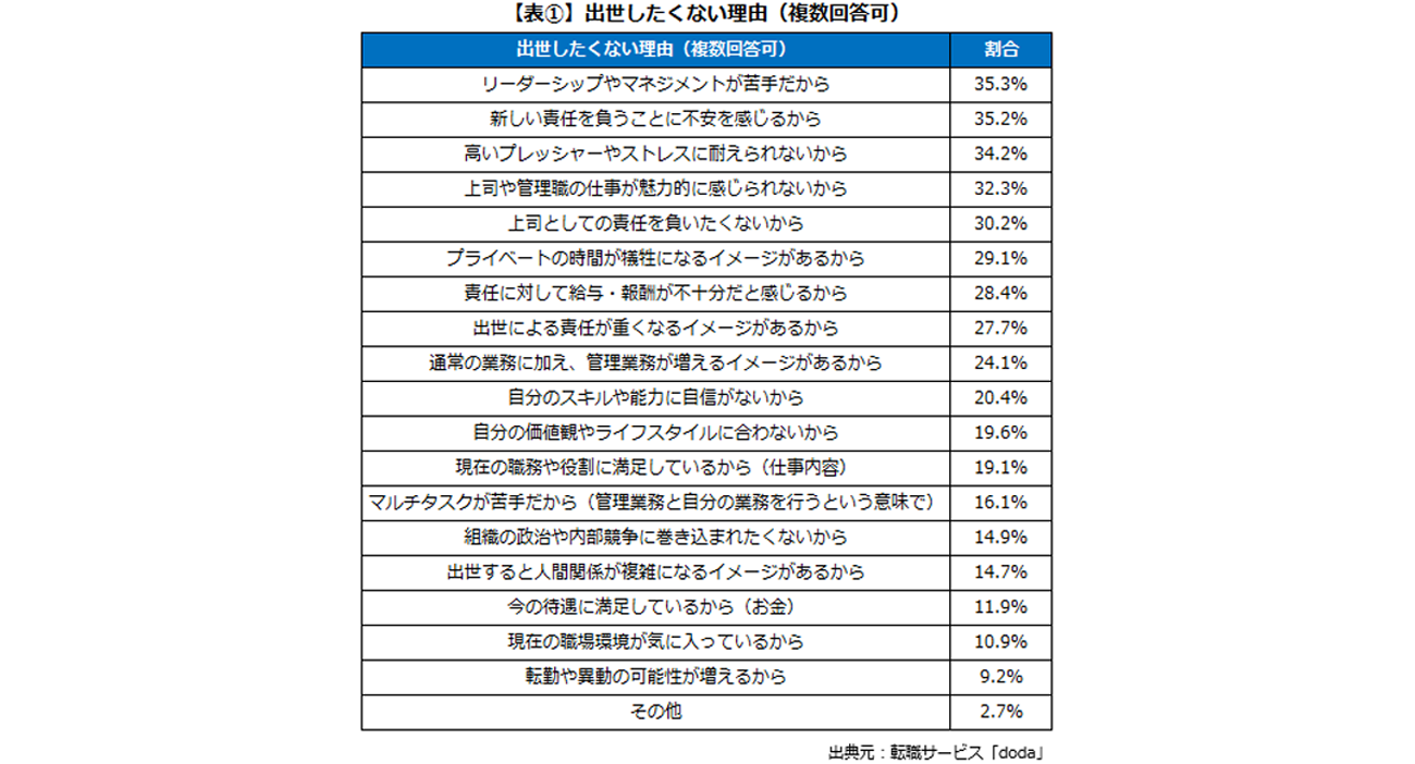 いまの会社で出世したくない理由:最多は「リーダーシップやマネジメントが苦手だから」(35.3%)