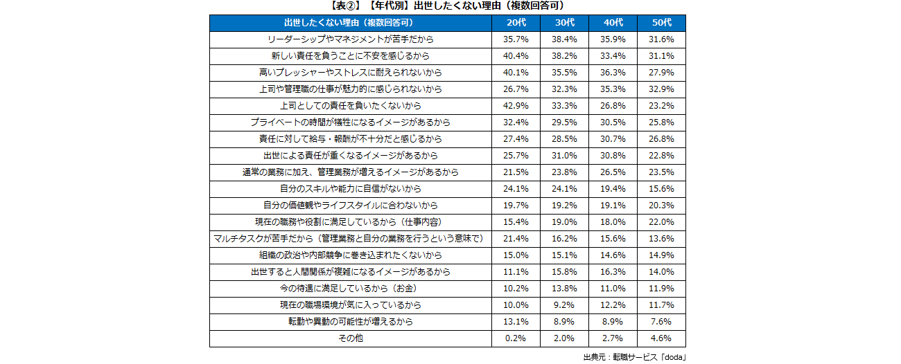 また、20代から50代のいずれの年代にも突出して多い理由は見られなかったが、20代の「上司としての責任を負いたくないから」(42.9%)は、他年代より高い傾向にあることがわかった。