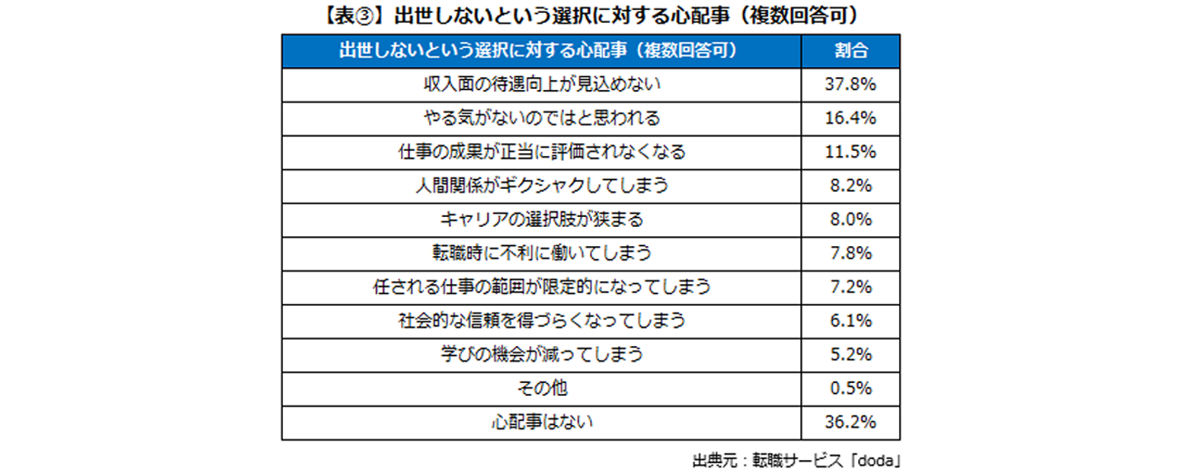 出世をしないという選択をした場合の不安として、もっとも多かったのは「収入面の待遇向上が見込めない」(37.8%)だった。次いで「やる気がないのではと思われる」(16.4%)、「仕事の成果が正当に評価されなくなる」(11.5%)となった。