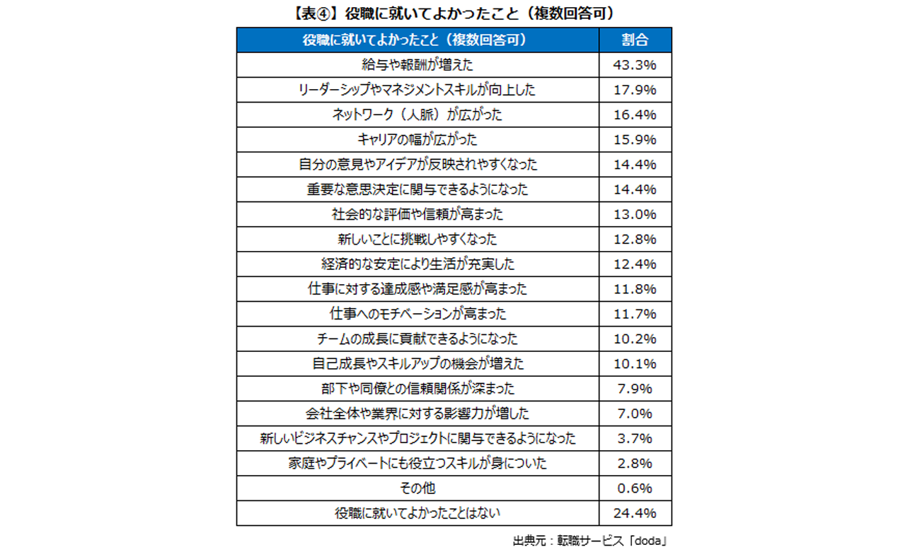 また、役職に就いてよかったこととしては、「給与や報酬が増えた」(43.3%)が突出しており、2位以降を引き離してトップになった。次いで「リーダーシップやマネジメントスキルが向上した」(17.9%)と「ネットワーク(人脈)が広がった」(16.4%)となった。