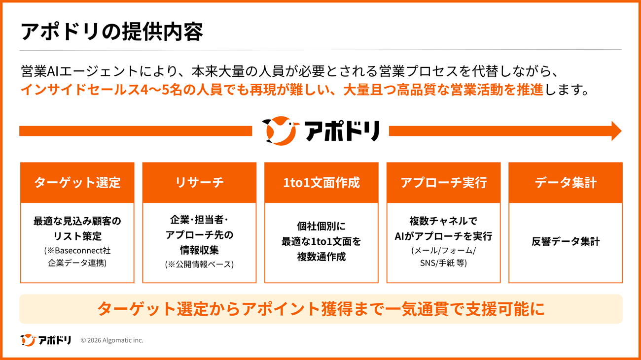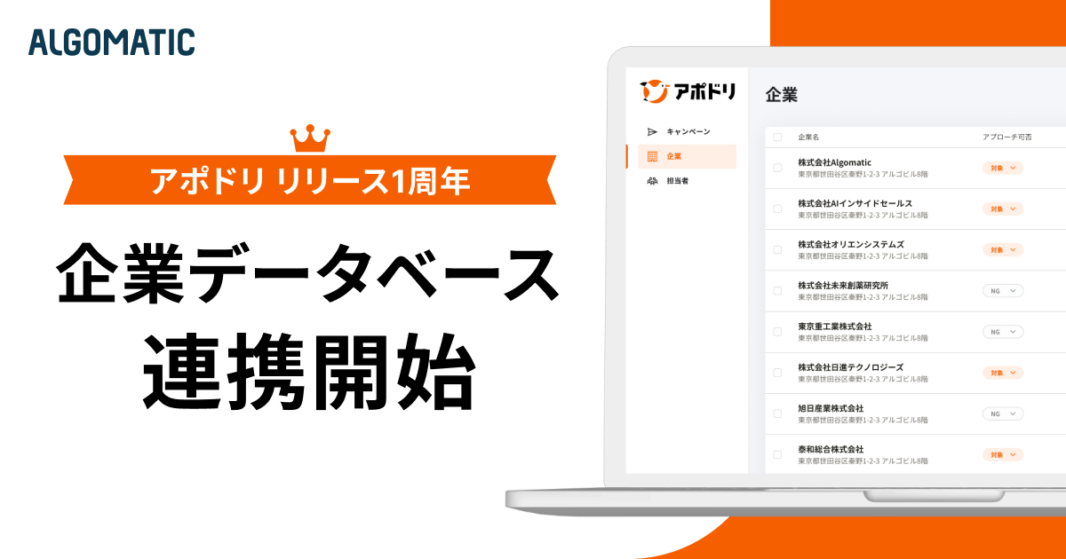 Algomaticが開発・提供する営業AIエージェント「アポドリ」は、BaseconnectのパートナーシップAPIを経由した企業データ連携を開始し、新機能として提供することを発表した。