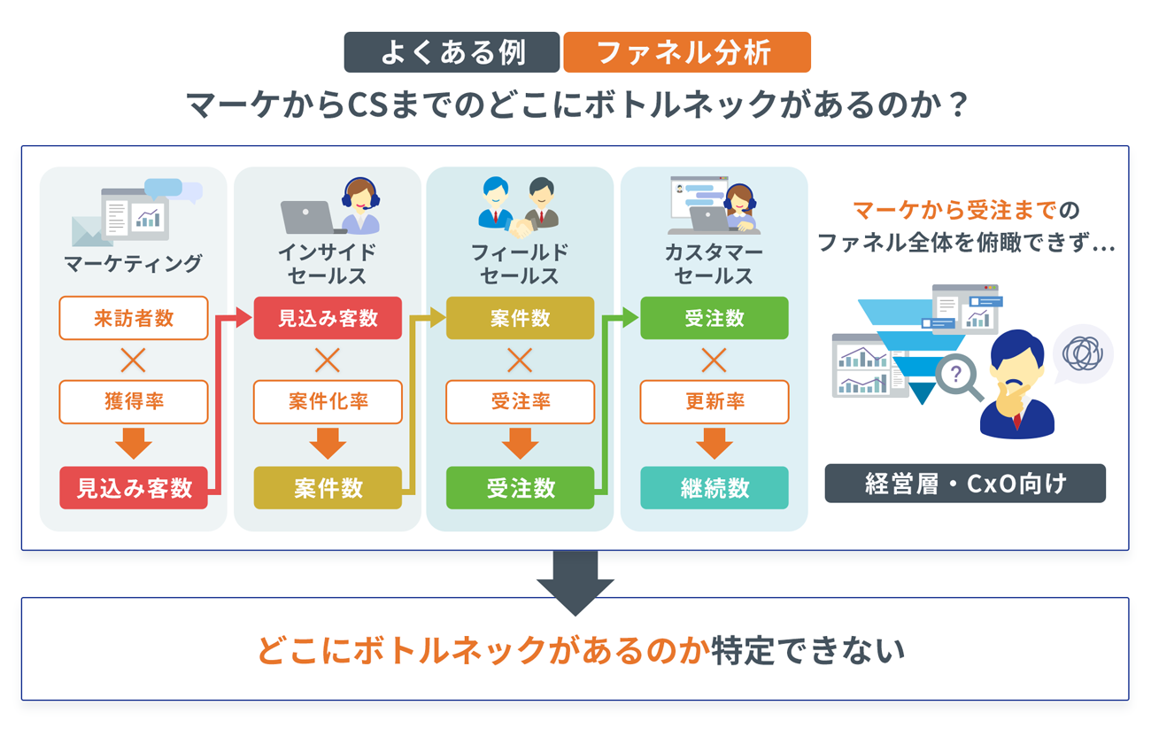 マーケティングから受注までのファネル全体を俯瞰し、どこで機会損失が起きているかを特定する。