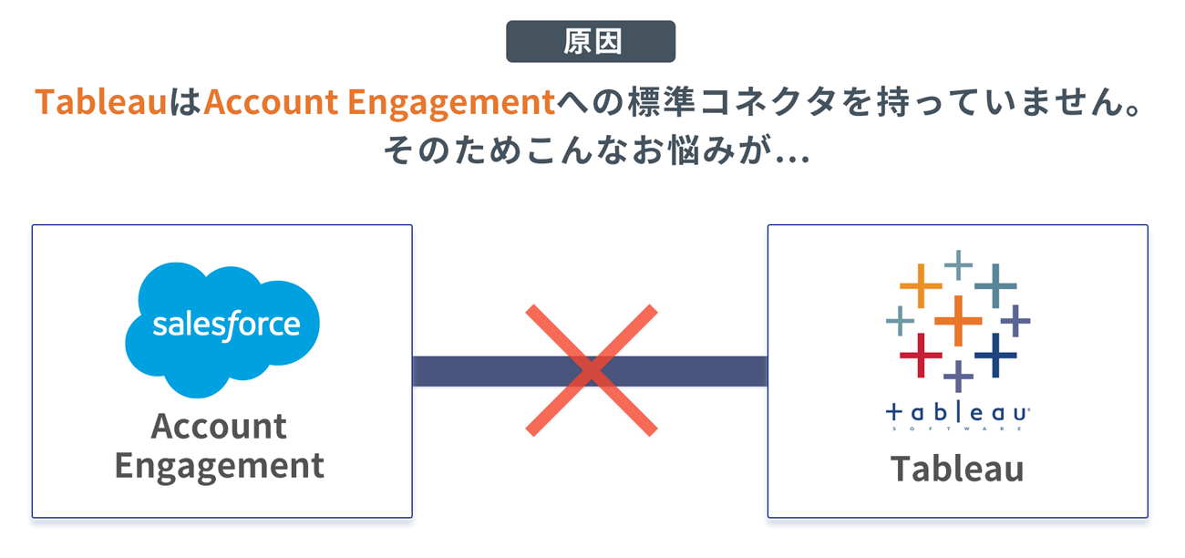 さまざまなBtoB企業では、マーケティング部門がAccount EngagementでリードのPV数やCV数を計測し、営業部門がSalesforce Sales Cloudで商談・受注を管理している。しかし、TableauはAccount Engagementへの標準コネクタを持っていないため、Account Engagementのデータを十分に分析できないという課題を抱える企業が一定数存在する。