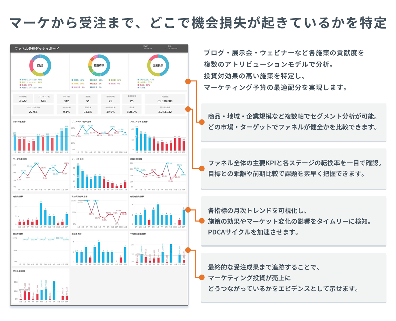 ファネル全体の転換率、施策別の貢献度分析などのダッシュボードを標準搭載。