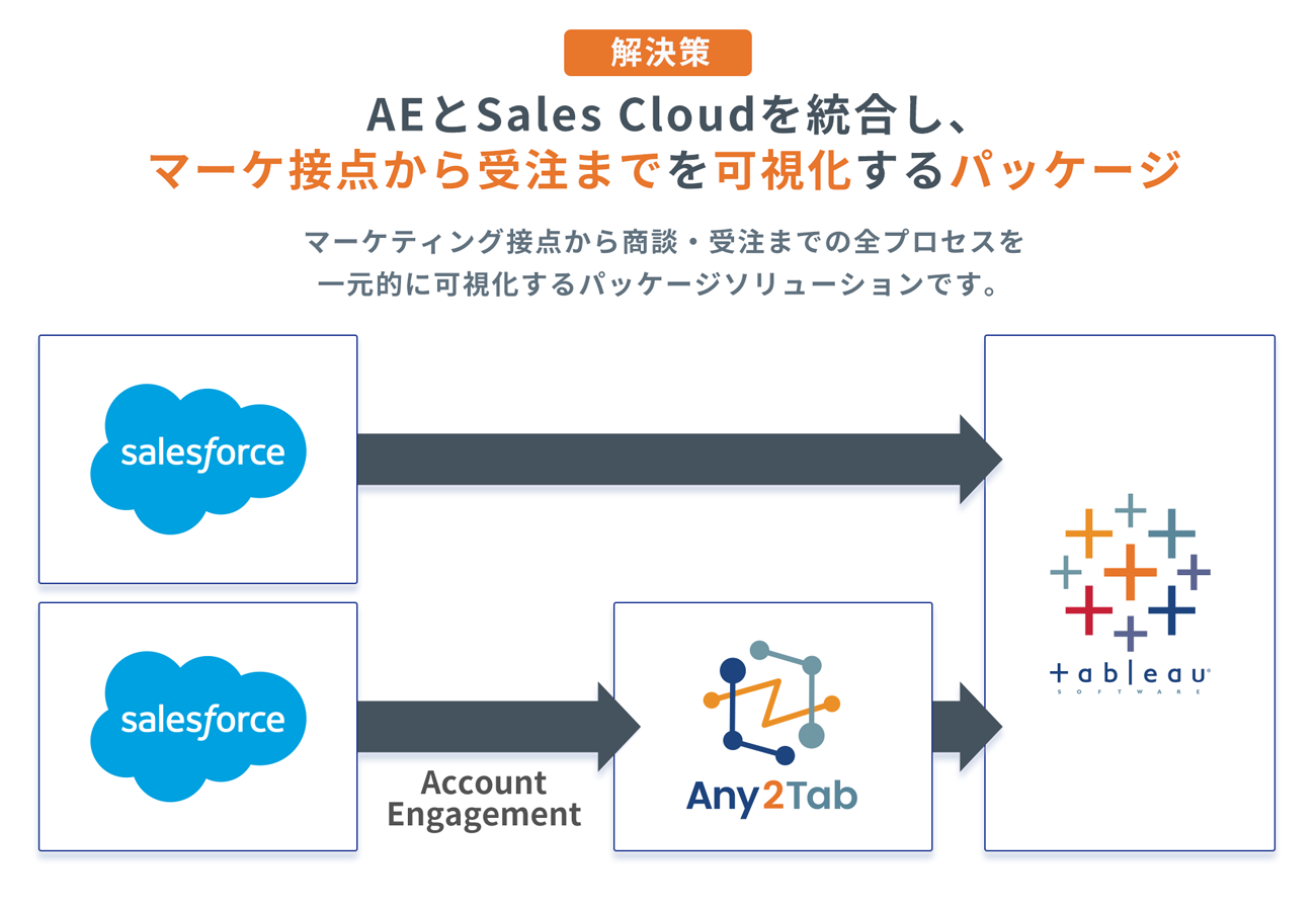 MA〜CRM Tableau統合ダッシュボード導入パッケージは、Account EngagementとSalesforce Sales CloudのデータをTableauに自動連携し、マーケティング接点から商談・受注までの全プロセスを一元的に可視化するパッケージソリューション。