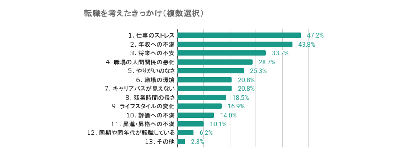 転職を考えるきっかけとしてもっとも多かったのは「仕事のストレス」で47.2%、次いで「年収への不満」が43.8%と続いた。3位は「将来への不安」で33.7%、4位は「職場の人間関係の悪化」で28.7%、5位は「やりがいのなさ」で25.3%となった。