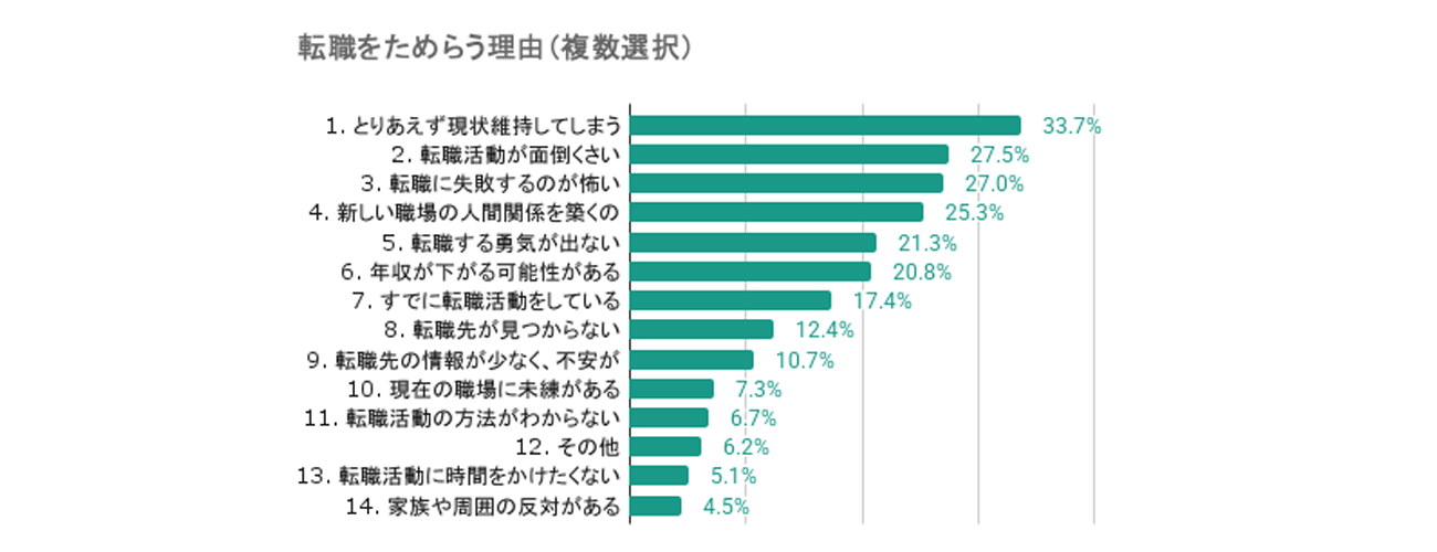 転職をためらう理由としてもっとも多かったのは「とりあえず現状維持してしまう」で33.7%、次いで「転職活動が面倒くさい」が27.5%、3位は「転職に失敗するのが怖い」が27.0%となった。4位は「新しい職場の人間関係を築くのが不安」で25.3%、5位は「転職する勇気が出ない」で21.3%と続いた。