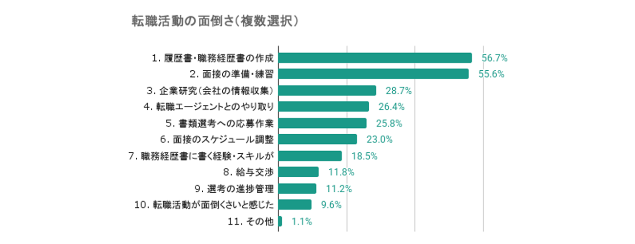 これらの結果から、転職活動における面倒さは、主に書類作成や面接準備などの具体的な作業への負担感に起因していることがわかる。とくに、履歴書・職務経歴書の作成と面接の準備・練習が半数以上を占めており、これらの作業は転職活動における主要な障壁となっている。