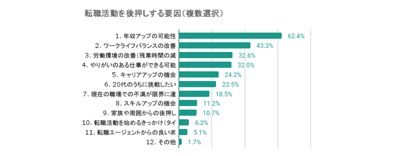 20代が転職活動を後押しする要因は、経済的なメリットと働き方の改善への期待が主な要因であることがわかる。「年収アップの可能性」は6割以上を占めており、経済的な動機が転職活動を後押しする重要な要因となっている。