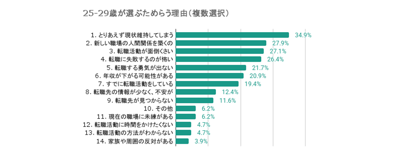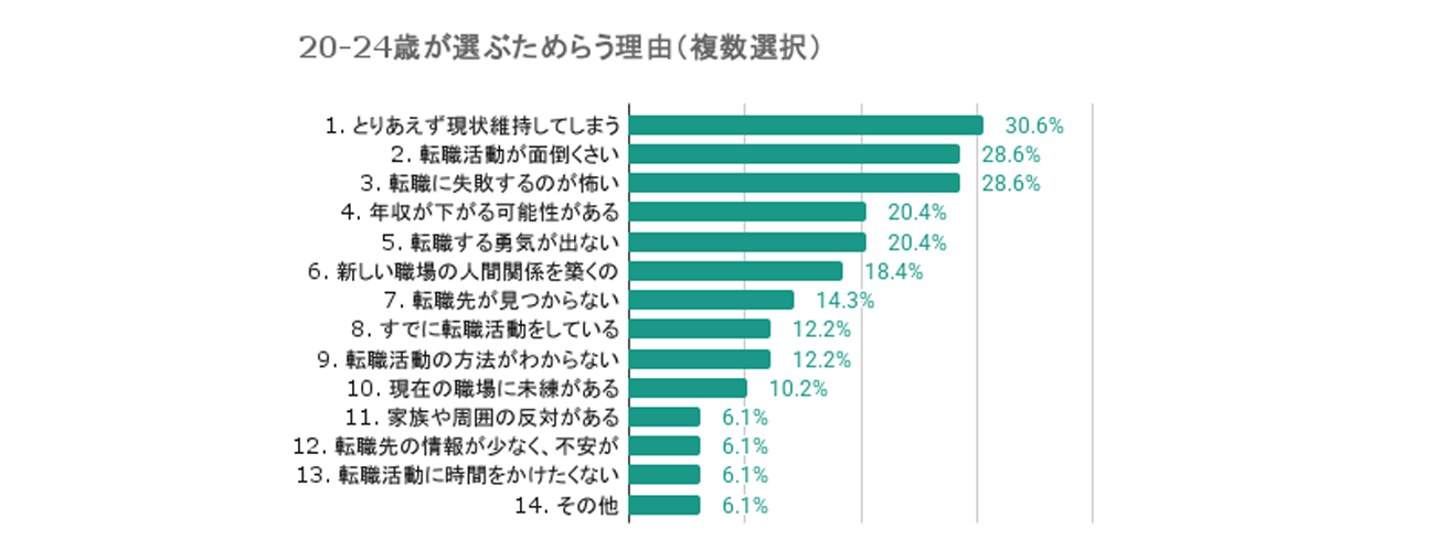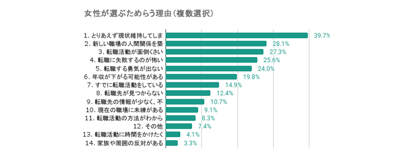 一方、20代の女性の方が「とりあえず現状維持してしまう」(39.7%)、「新しい職場の人間関係を築くのが不安」(28.1%)を選ぶ割合が高く、女性特有の不安が浮かび上がった。