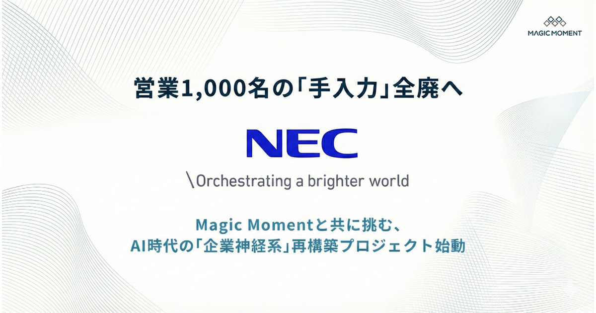 Magic Momentは、日本電気(以下、NEC)が、営業組織の抜本的変革基盤として「Magic Moment Playbook」を採用し、1,000名規模での導入を開始することを発表した。また両社は、NECの全社導入を見据えて「企業神経系」再構築プロジェクトを始動する。