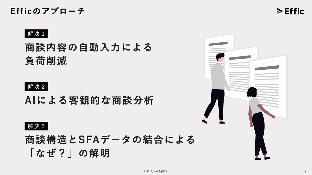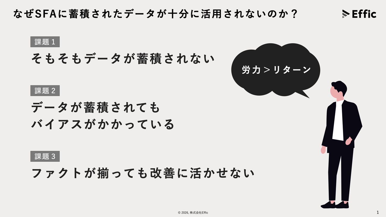 さまざまな企業で導入が進んでいるSFAだが、「なぜ売れたのか/なぜ売れなかったのか」という理解に結びついていないのが実情である。Efficは、この構造的課題に対し、SFAの価値を最大化するための次のアプローチを提供する。
