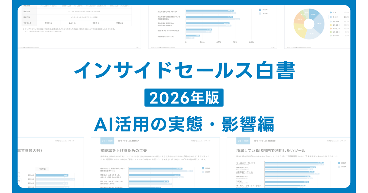 immedioが提供するAIインサイドセールス「immedio」は、全国のインサイドセールス職245名を対象に、AIの活用状況に加え、AI活用を踏まえた自社サイトの流入・CVR改善に向けた取り組み状況について調査を実施し、その結果をまとめた「immedioインサイドセールス白書2026」を発刊した。