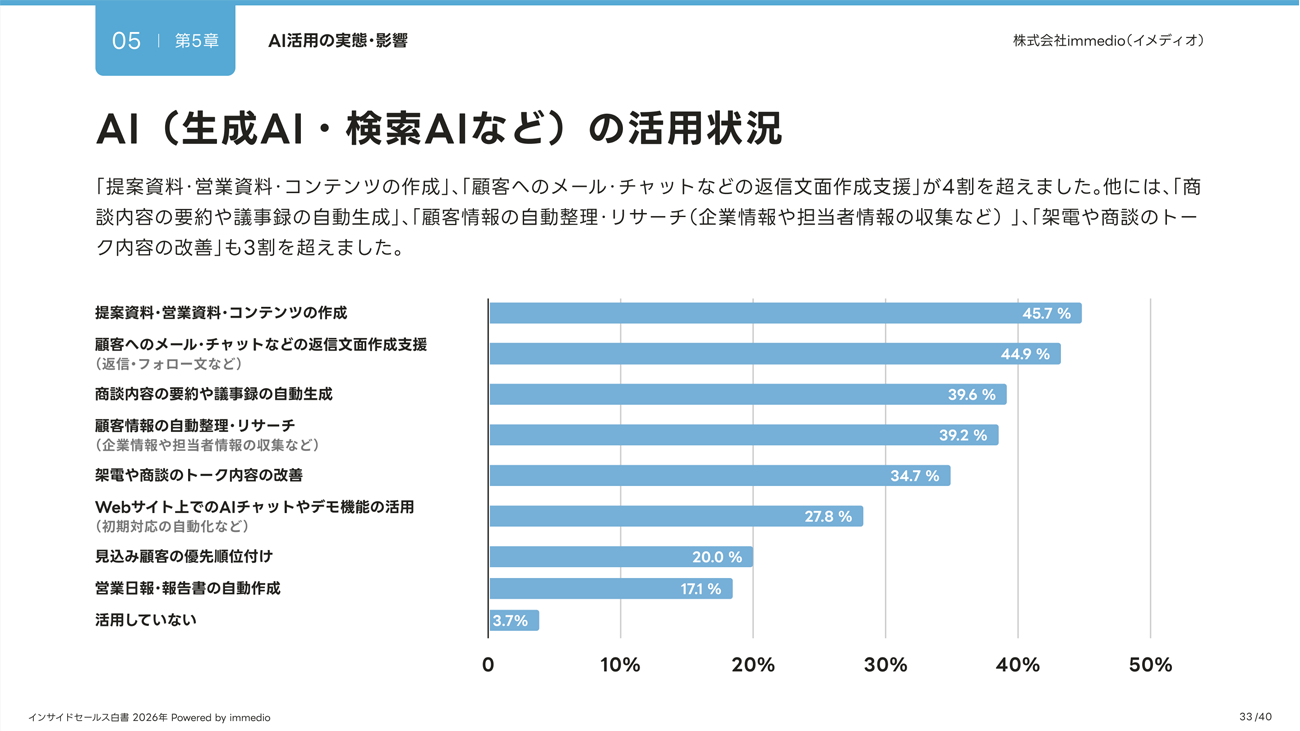 AI活用は「提案資料・コンテンツ作成」「顧客への返信文面の作成支援」が中心