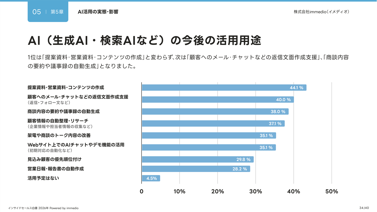 AI(生成AI・検索AIなど)の今後の活用用途は、1位は44.1%で「提案資料・営業資料・コンテンツ作成」だった。次いで、「顧客へのメール・チャットなどの返信文面作成支援」(40.0%)、「商談内容の要約や議事録の自動生成」(38.0%)となった。また、「見込み顧客の優先順位付け」(29.8%)への活用も期待されていることもわかった。