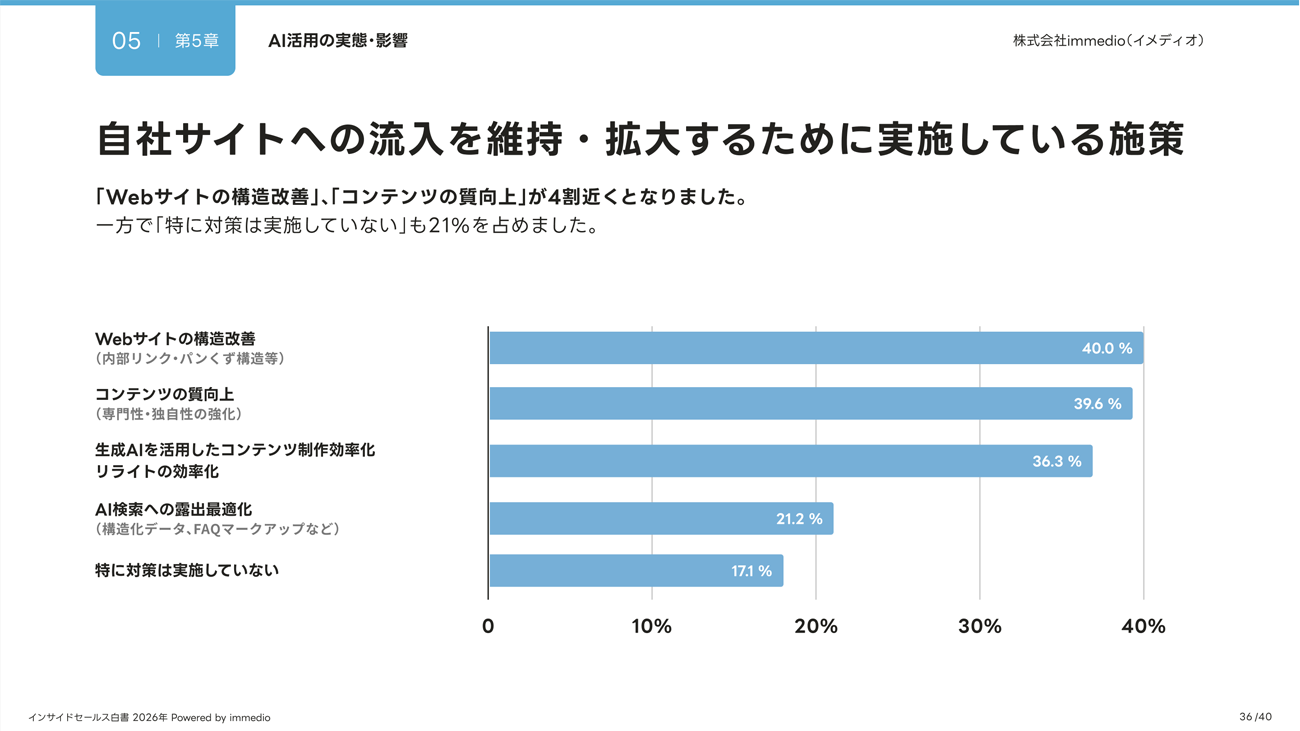 自社サイト流入の維持・拡大に向けたウェブ施策では、「Webサイトの構造改善」(40.0%)、「コンテンツの質向上」(39.6%)が4割近くに上った。一方で「特に対策は実施していない」も21%を占めた。