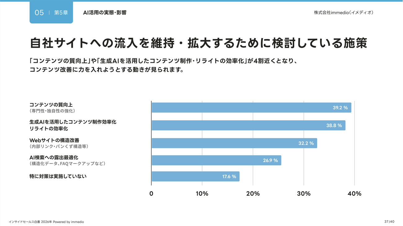 自社サイト流入の維持・拡大に向けたウェブ施策では、「コンテンツの質向上」(39.2%)や「生成AIを活用したコンテンツの制作・リライトの効率化」(38.8%)が約4割を占め、コンテンツ改善への注力度が高まっていることがわかった。加えて、ウェブサイト構造の改善やAI検索への露出最適化など、基盤整備への取り組みも進んでいることもわかった。