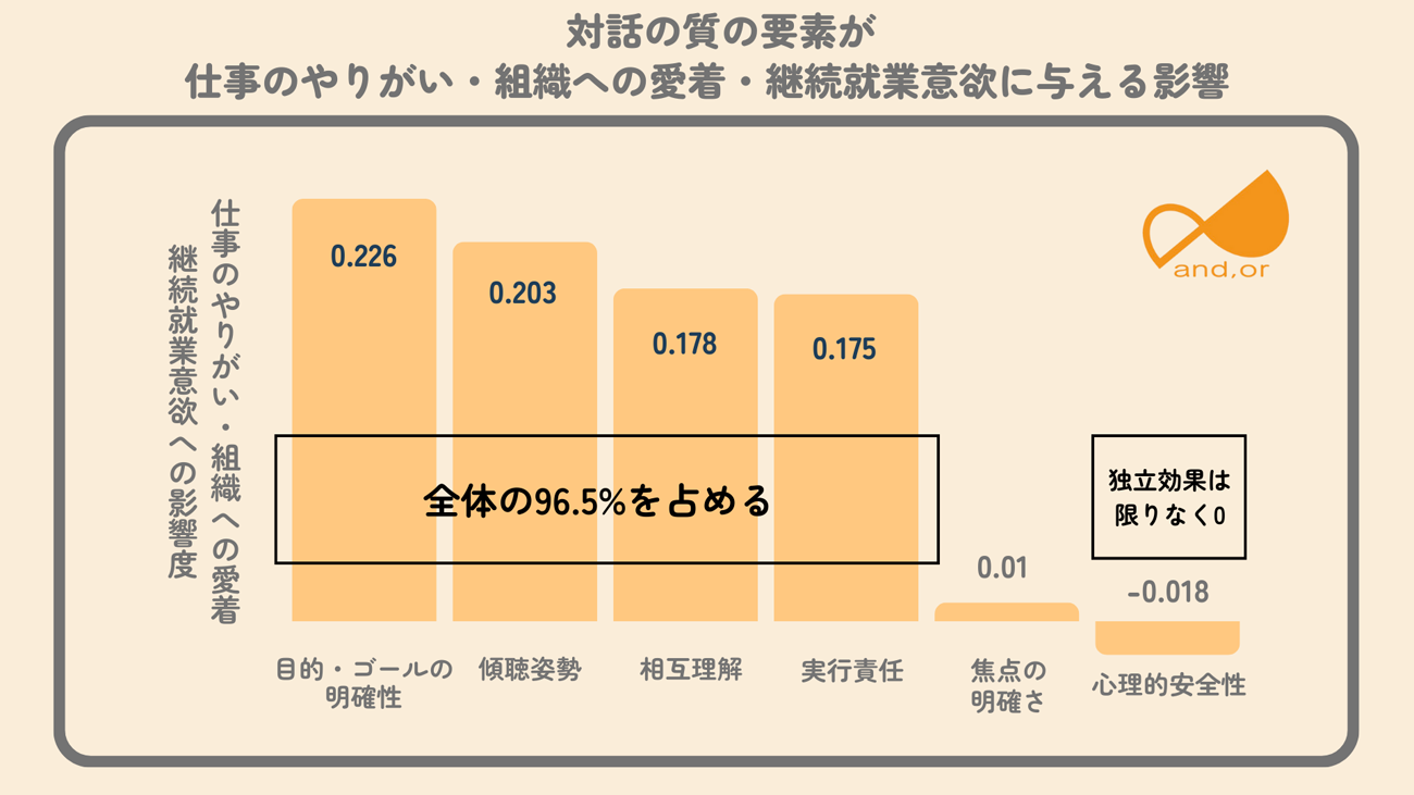 影響度を測る統計分析の結果、心理的安全性が成果(やりがい・組織への愛着)に与える直接的な影響は低いことがわかった。