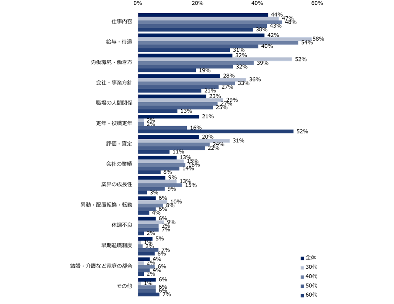 年代別で見ると、「希望の仕事内容に従事できるか」は30代:27%、40代:31%、50代:42%、60代:52%と年代が上がるほど回答者が増える結果に。次点の「年収アップできるか」は、30代:27%、40代:23%、50代:18%、60代:6%と、年代が上がるほど回答者が減少する結果になった。