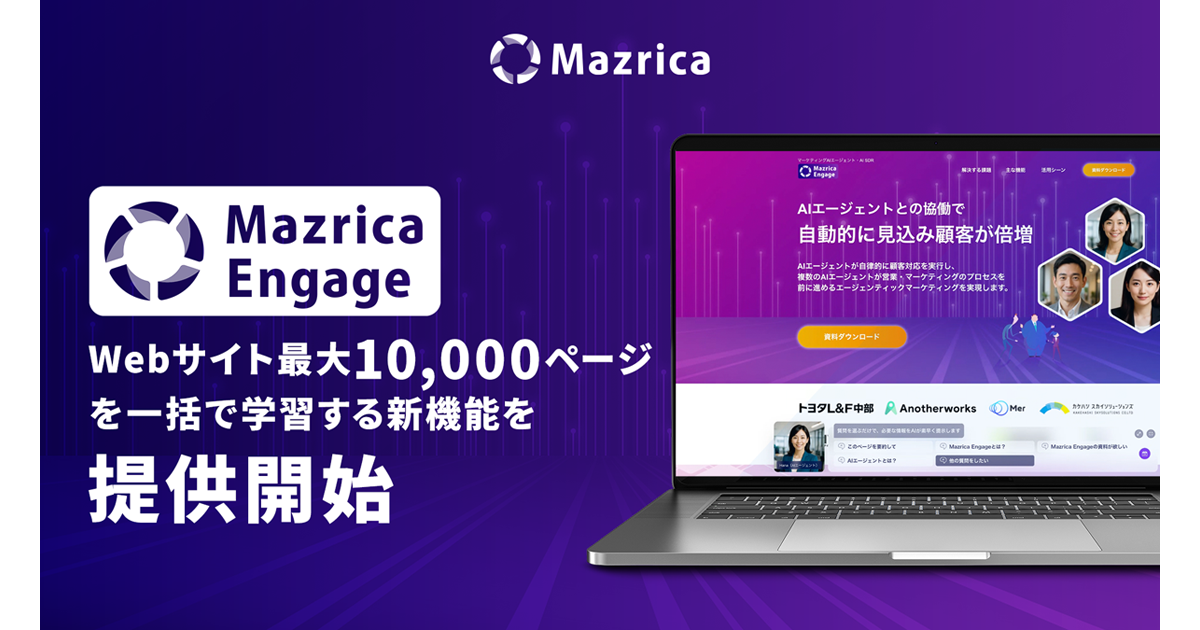 マツリカは、提供するマーケティングAIエージェント「Mazrica Engage(マツリカエンゲージ)」において、指定したウェブサイト配下の最大10,000ページを一括でAIに学習させることができる機能の提供を開始した。
