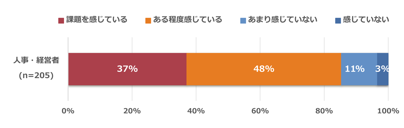 上司と部下の関係性に対する課題感に関して、人事・経営者のうち「課題を感じている」(37%)、「ある程度感じている」(48%)となり、合わせて約8割が課題を認識している結果となった。