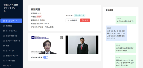 AIが営業役となり、手本となる商談を実演する。言葉の選び方や話の組み立て方を視覚・聴覚的に理解できるため、新人や若手でも「目指すべきゴール」を明確にイメージしてから練習を開始できる。