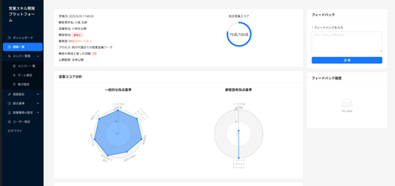 2,000人以上のトップセールスの行動モデルに基づき、商談を採点。レーダーチャート分析や具体的な改善アドバイスを自動生成する。また、自社独自の評価指標へのカスタマイズも対応可能。