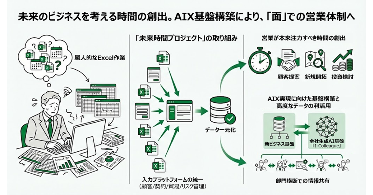 伊藤忠商事の化学品部門における「未来時間プロジェクト」では、未整備だった業務領域のシステム化により、入力プラットフォームを統合。属人的なExcel作業の削減とデータの一元化を実現した。これら業務の省力化を通じて、営業が本来注力すべき「顧客提案・新規開拓・投資検討」のための時間を創出した。本システムは、2025年7月より本格稼働を開始している。