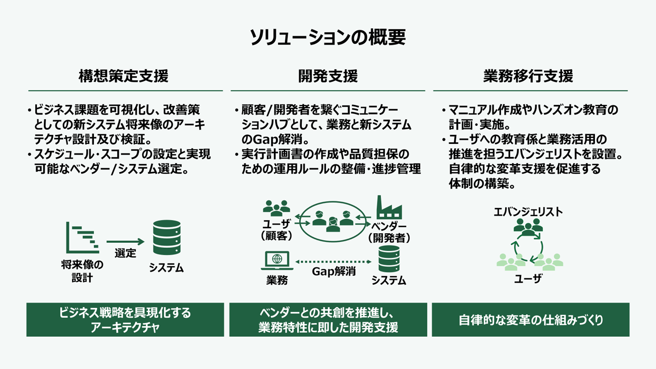 これらを軸にLTSは、構想策定から開発、業務移行に至るまで、一気通貫でのプロジェクト推進を支援した。
