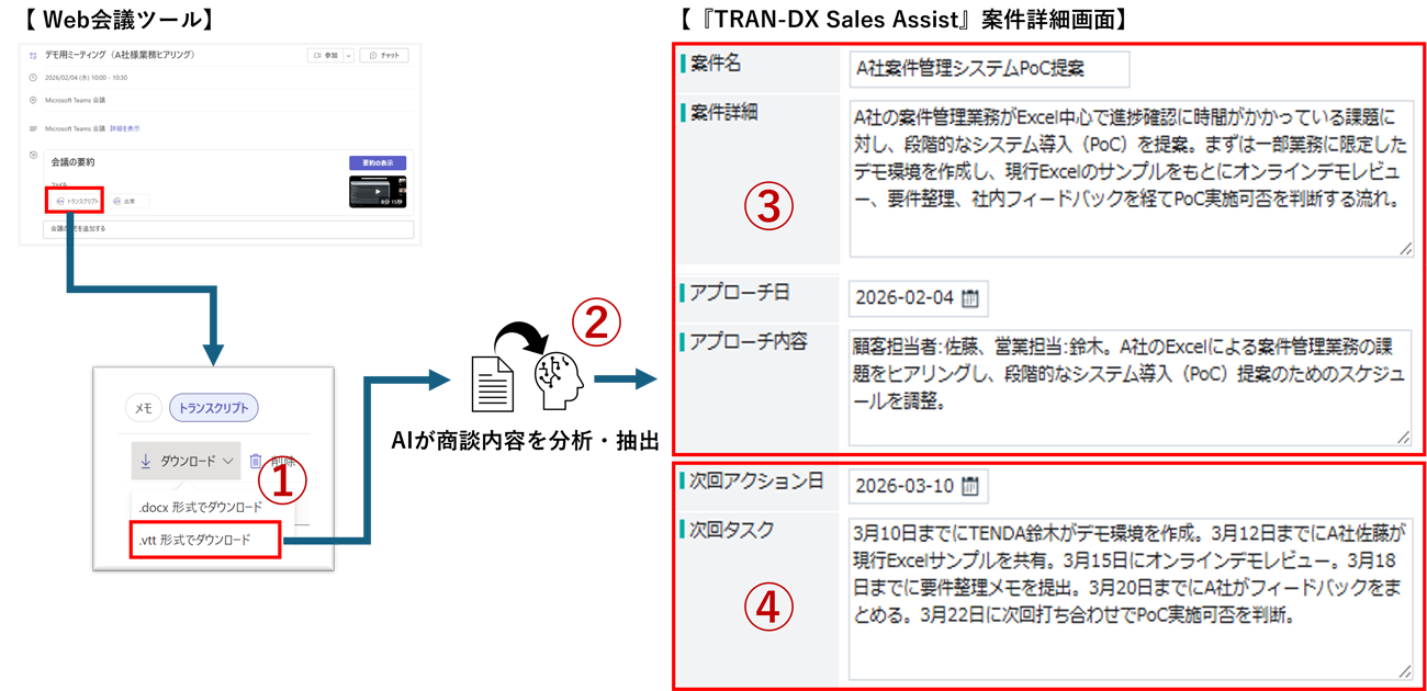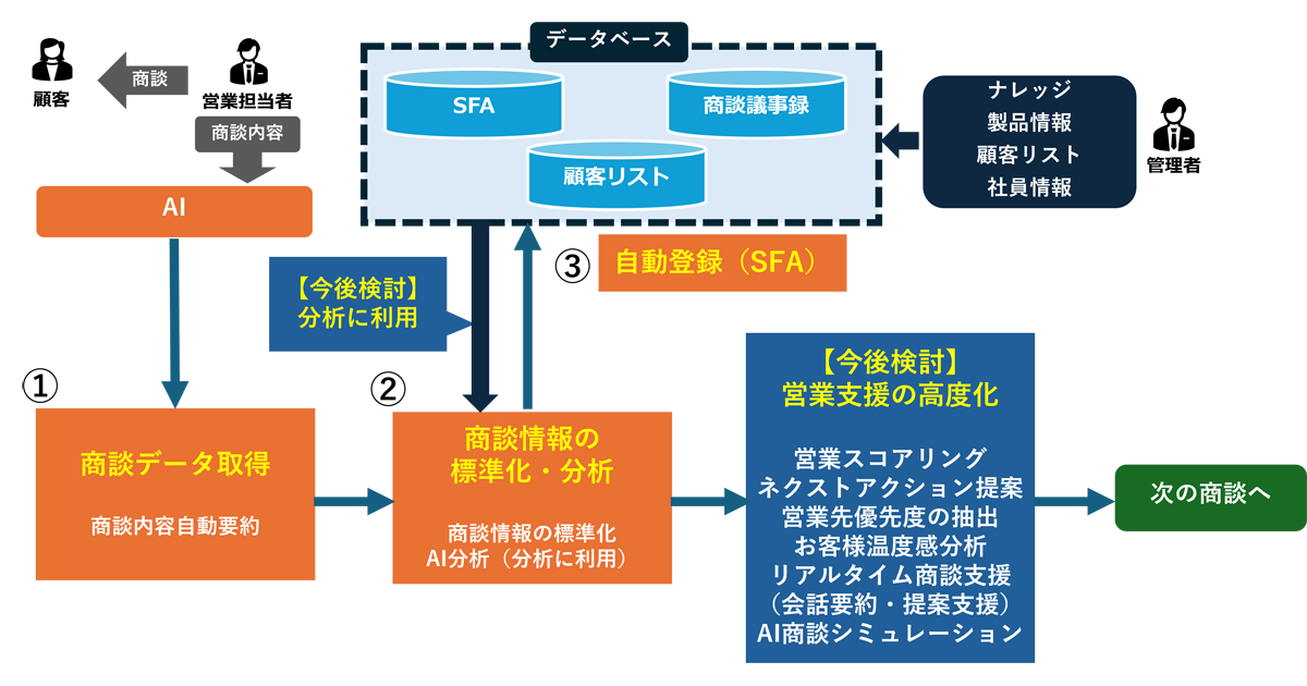 「TRAN-DX Sales Assist」の全体イメージ(①〜③は、実際の商談データを用いたPoCで確認した内容)