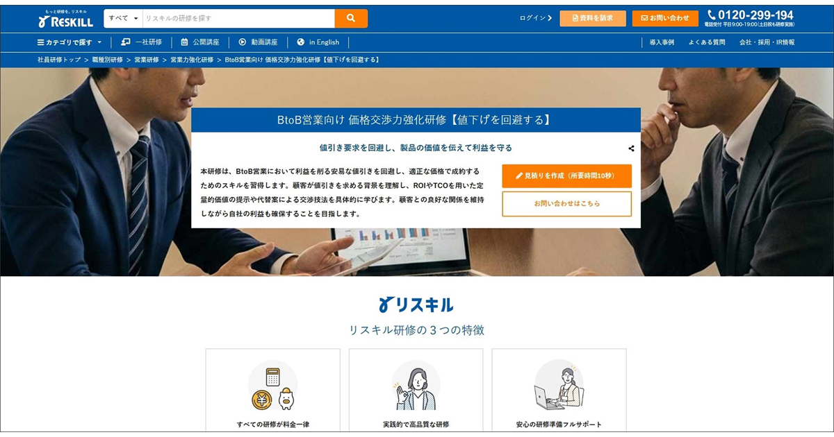 こうした課題を背景に、論理的な価値訴求と戦略的な交渉スキルの習得を目的とした研修へのニーズが高まっている。これを受けリスキルは、BtoB営業向け 価格交渉力強化研修の提供を開始した。