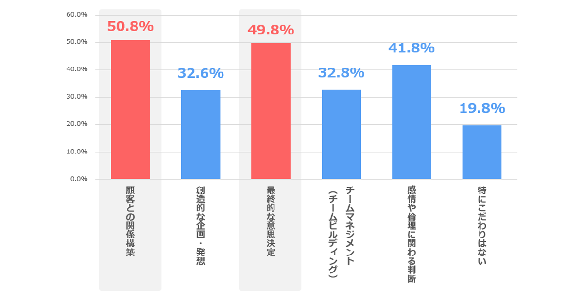 「人が担うべきだと思う業務はどれですか?」という設問に対して、「顧客との関係構築(50.8%)」が最多だった。次いで、「最終的な意思決定(49.8%)」と、回答者の約半数が、企業の信頼形成や意思決定といった核心領域はAIでは代替できず、人に任せるべきだと考えていることが判明した。