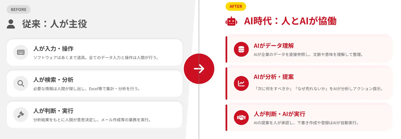 GoCoo!は従来のSFAを否定するものではなく、SFAをAI時代に対応する形へとアップデートしたプロダクトである。単に人が利用する営業管理ツールにとどまらず、人とAIの双方が営業活動の判断、分析、自動化に活用できる営業データ基盤としての役割を担う。これが、SALES GOが定義するSFAおよびSoRの形態である。