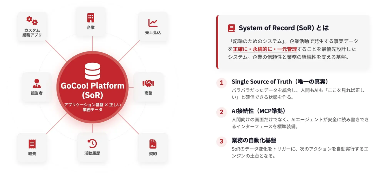 同社のプロダクト「GoCoo!」は、市場ではSFAとして提供されているが、その実態は、SFAをAI時代に対応する形へとアップデートしたSoR(※)である。一般的な営業管理ツールとは異なり、営業情報を一元的に蓄積し、ほかの業務システムやAIが参照・活用できる設計となっており、営業や企業経営に関わるデータの保存場所として機能する。営業データを起点に企業活動を支える、SoRとして機能するプロダクトである。