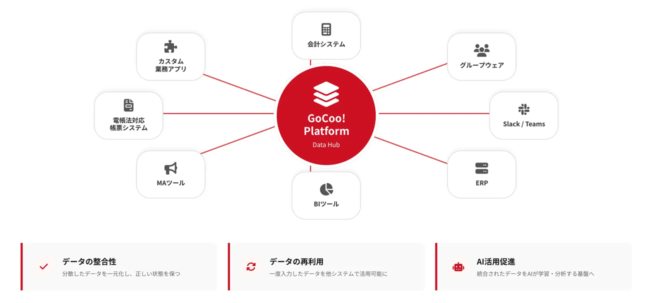 GoCoo! Platformは、企業情報、担当者情報、商談、活動履歴、売上見込などの営業データに加え、契約情報や各種業務データまで柔軟に管理できるSoRであると同時に、業務アプリケーションが動作するアプリ基盤でもある。さらに、REST APIと業務自動化連携エンジンを通じて、会計システム、MAツール、BIツール、チャットツール、帳票システム、ERPなどの外部システムと接続し、企業活動全体を支えるData Hubとして機能する。