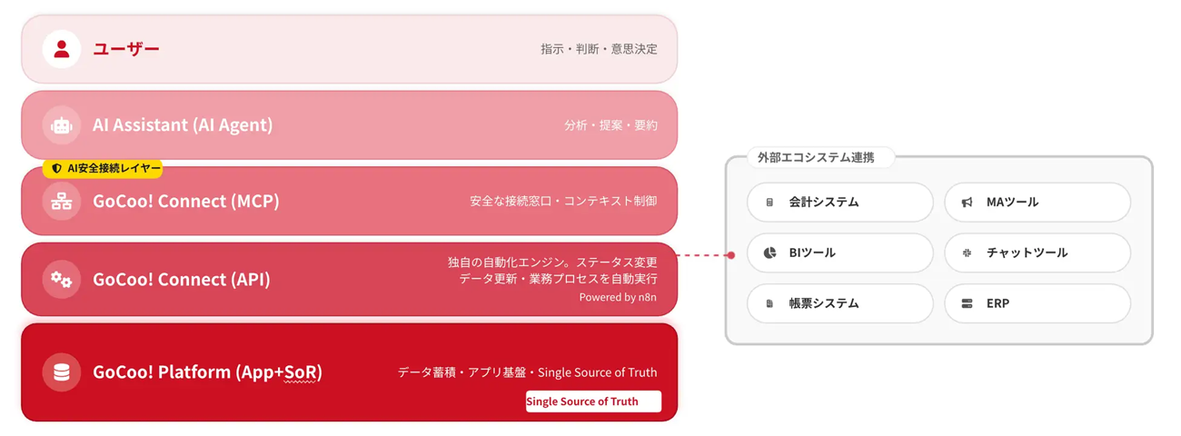 AI時代のGoCoo!アーキテクチャでは、GoCoo! PlatformをSingle Source of Truth(信頼できる唯一の情報源)とし、その上に業務自動化連携エンジンとREST API、さらにMCPを配置することで、AIが正しいSoRデータのみを安全に参照できる構造を可能にしている。これにより、AIはハルシネーションを抑制しながら、分析、提案、要約、業務支援に活用され、ユーザーはAIと協働しながら意思決定や業務遂行を進めることができる。