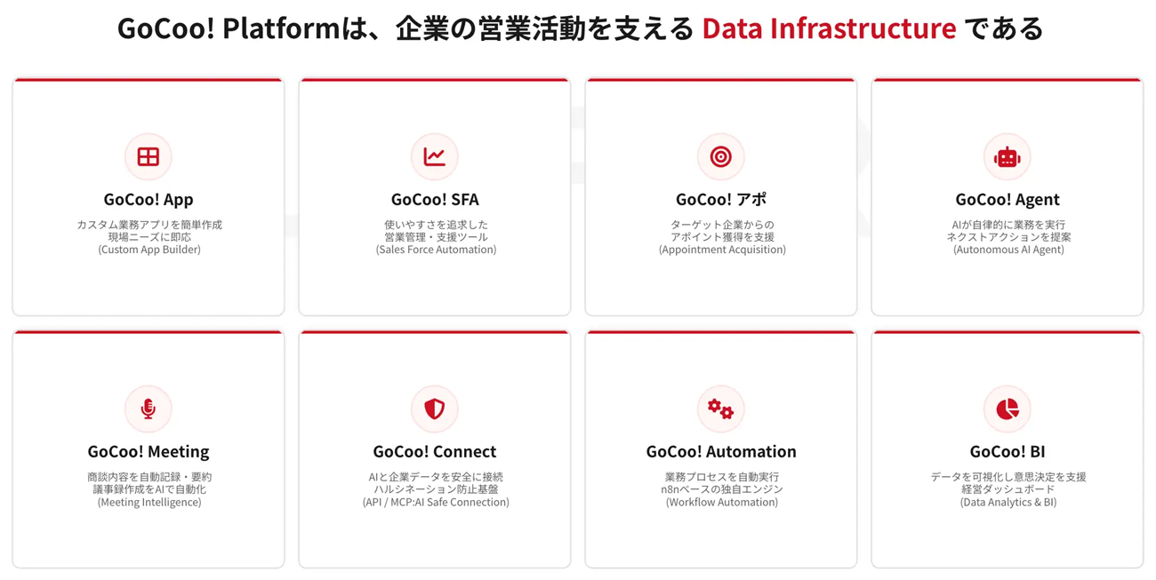 今後、SALES GOは、GoCoo! Platformを通じて、営業を起点に企業活動全体を支えるAI時代のデータ基盤を提供し、日本企業の業務変革を推進してまいります。