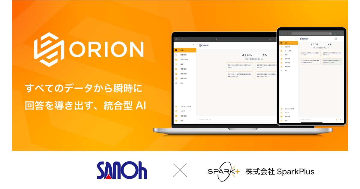 SparkPlus(読み:スパークプラス、以下、Spark+)は、企業内に蓄積されたさまざまな形式の社内データを横断して回答・提案するAIエージェント「ORION(オリオン)」が、三桜工業の生成AI活用基盤として導入されたことを発表した。